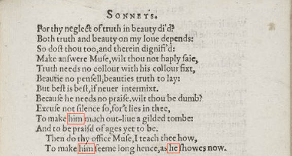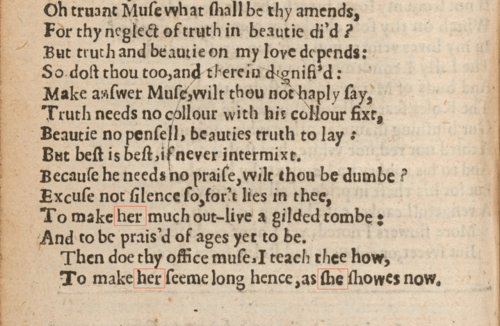 Benson combines Sonnets 100 and 101 into one poem he calls “An invocation to his Muse.” Within Sonnet 101 Benson changes the pronouns he and him to she and her. The changed pronouns are highlighted with red boxes in the images below.