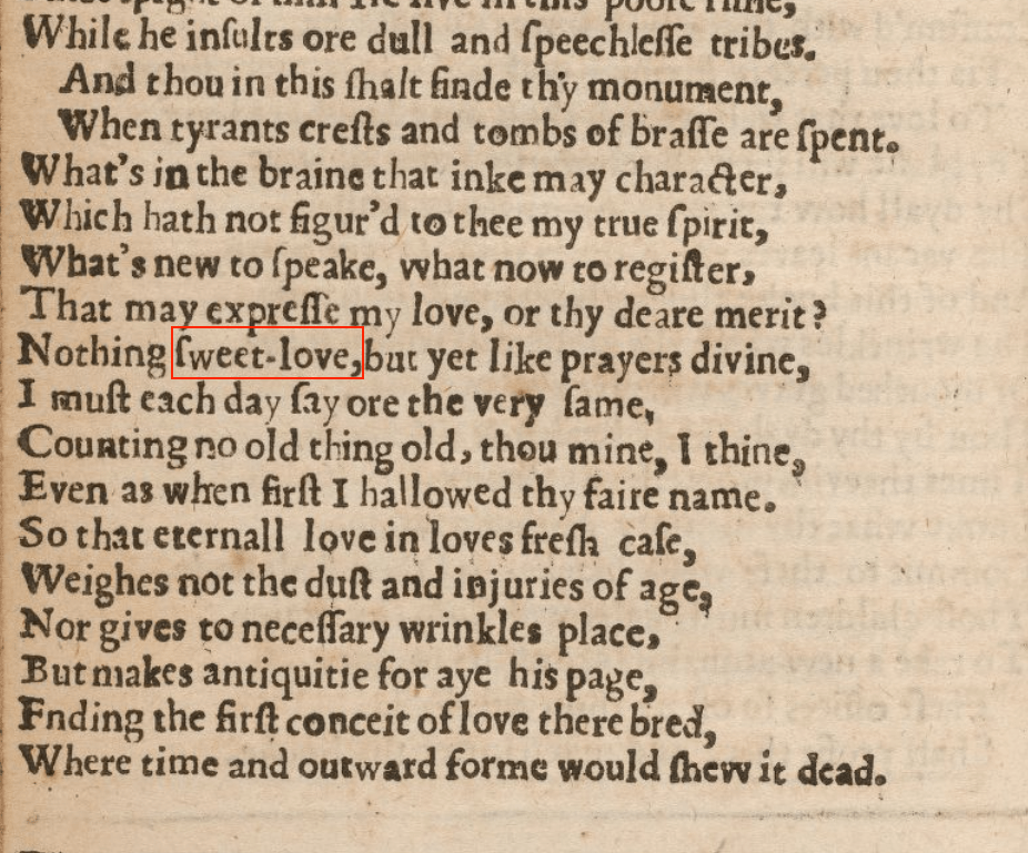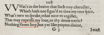 The other sonnet that Benson edited was Sonnet 108. Sonnet 108 is combined with Sonnet 107 under the title of “A monument to Fame.” The line, “Nothing sweet boy, but yet like prayers diuine,” is changed to, “Nothing sweet-love, but yet like prayers divine.” This change can be seen in the images below, changes are again highlighted with red squares.