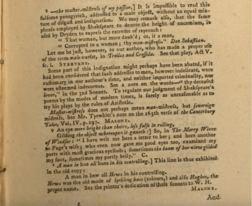 Looking into Malone’s commentary on just the sonnets themselves could be its own blog, but it is the comments on Sonnet 20 that I want to focus on here. While there is debate regarding whether Benson’s edits were purposefully obfuscating queerness, there is little question as to Malone’s stance on the queerness of the Sonnets.